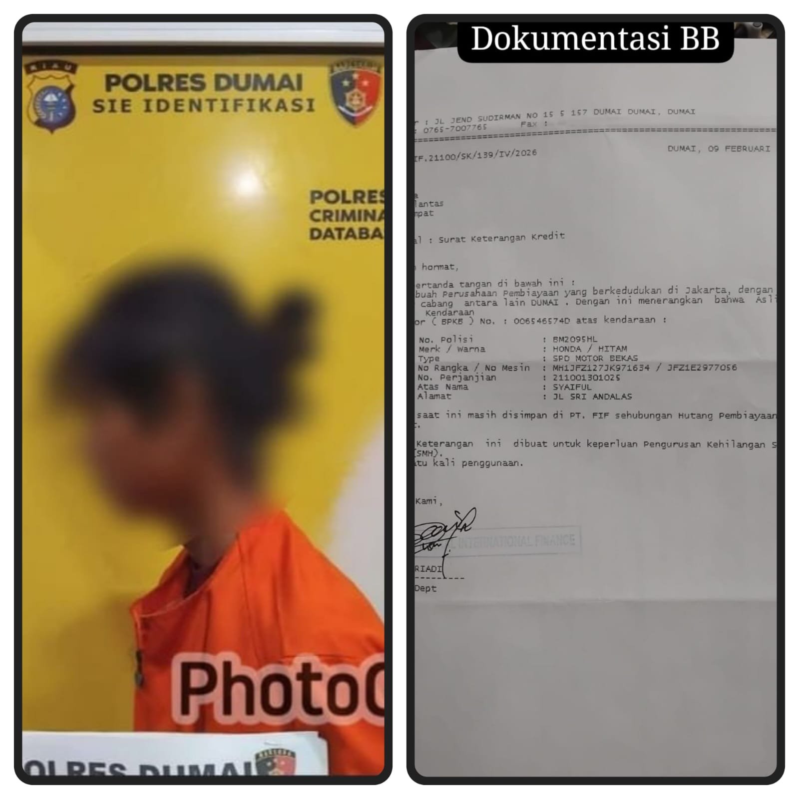 Tidak sampai disitu, lanjut AKP Agung menerangkan, sejumlah barang bukti yang disita meliputi 1 lembar Surat Keterangan Jaminan Leasing dari FIF dan 1 buah flashdisk berisi rekaman CCTV sudah diamankan di Mapolres Dumai.